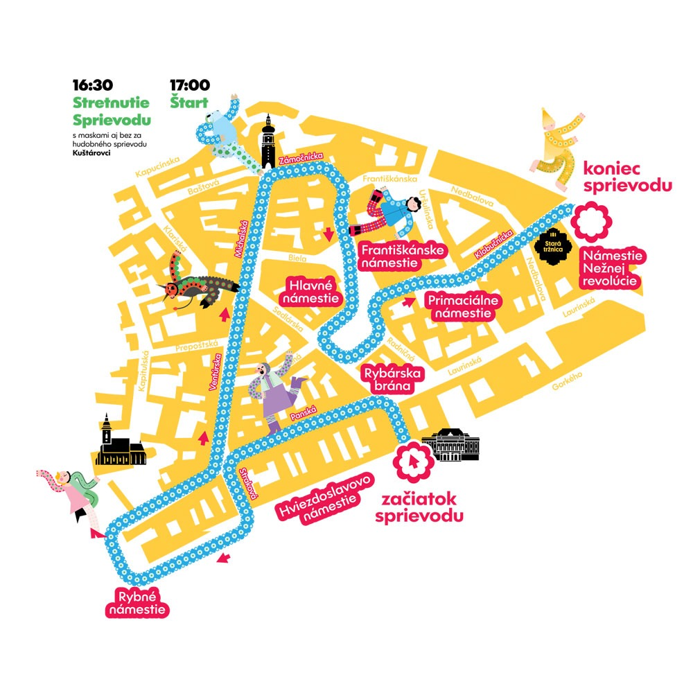 Program je rozdelený na dve časti, dennú a večernú. Doobeda si prídu na svoje najmä deti. Na Námestí Nežnej revolúcie ich čaká bohatý program plný zábavy, hudby, tanca aj tvorivosti a v Starej tržnici ich čaká výroba vlastných masiek. Večerná časť je určená hlavne pre dospelých, ktorí si budú môcť užiť zábavu a tancovanie až do neskorých nočných hodín.